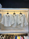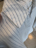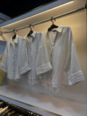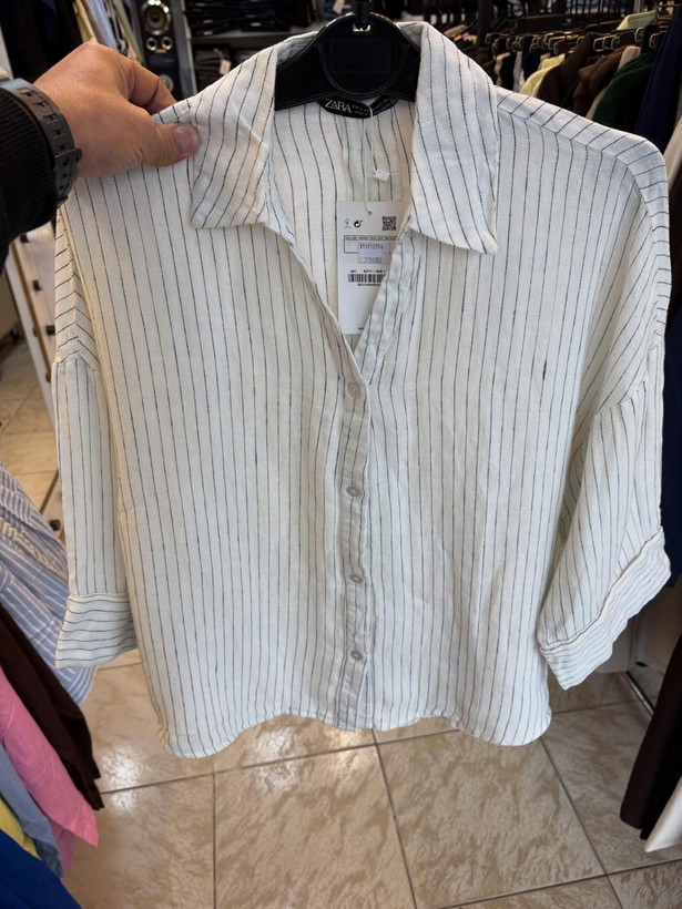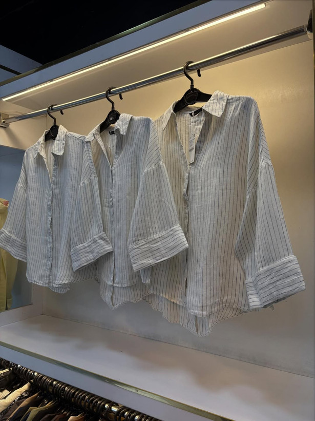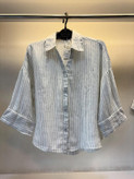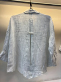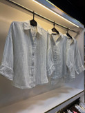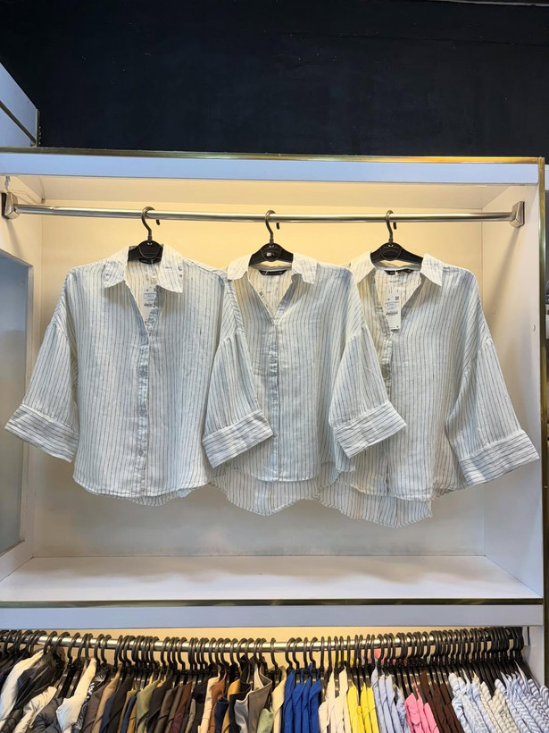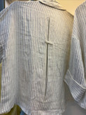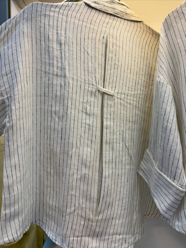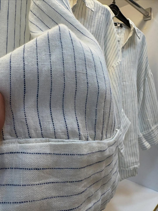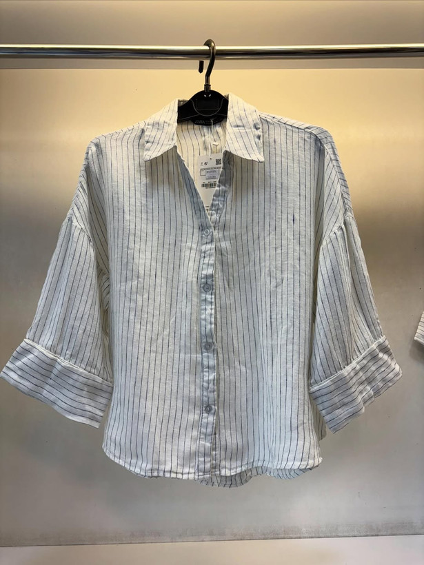 شومیز کراپ راه راه وارداتی رنگ شیری با میل های ابی رنگ جنس لینن ترک سایز بندی دارد